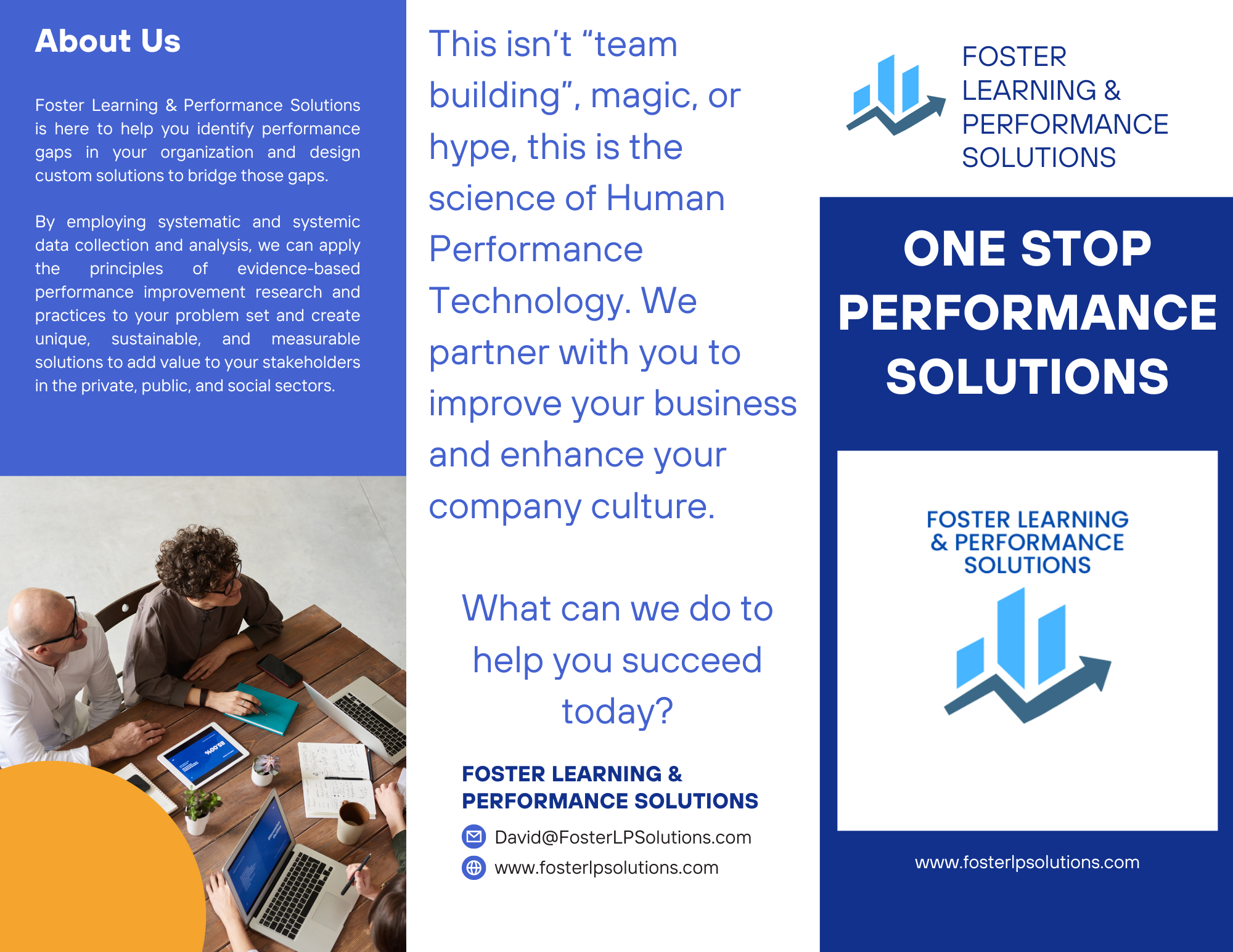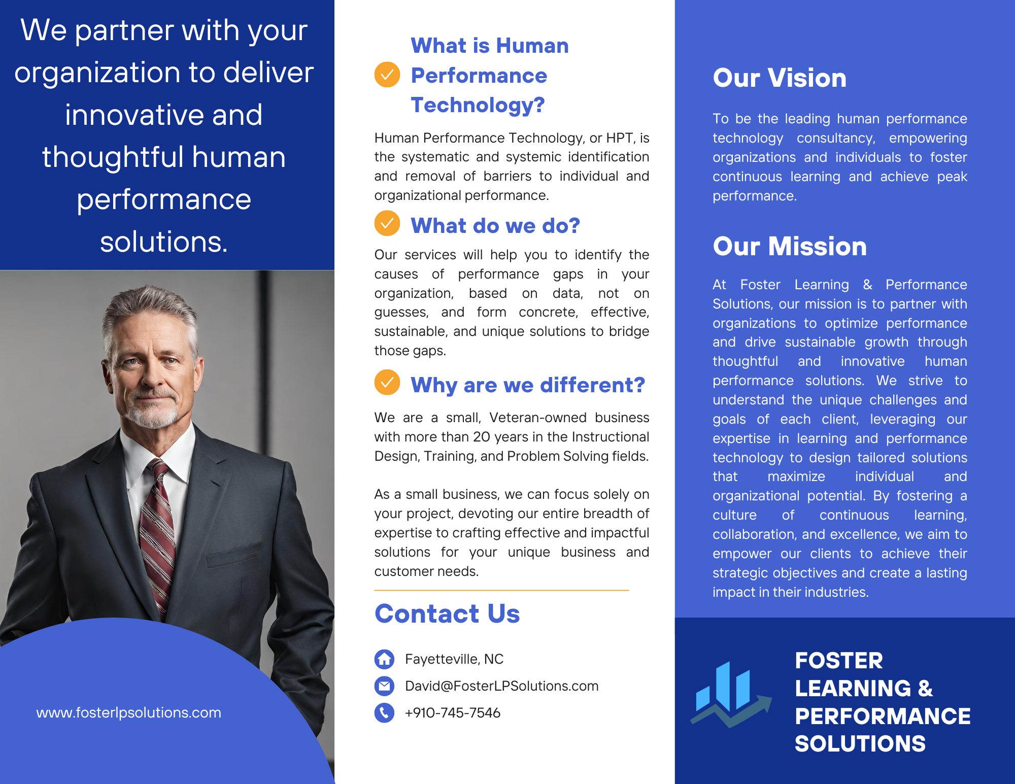At Foster Learning & Performance Solutions, our mission is to partner with organizations to optimize performance and drive sustainable growth through thoughtful and innovative human performance solutions. We strive to understand the unique challenges and goals of each client, leveraging our expertise in learning and performance technology to design tailored solutions that maximize individual and organizational potential. By fostering a culture of continuous learning, collaboration, and excellence, we aim to empower our clients to achieve their strategic objectives and create a lasting impact in their industries.